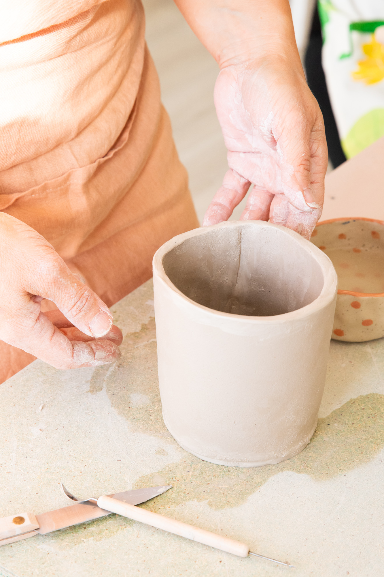 Savet ostetaan studiolta erikseen tai vaihtoehtoisesti käytössä voi olla omat savet, jos ne ovat korkeanpolton savia. Varaa omille savillesi joku kannellinen laatikko jos säilytät niitä studiolla.
